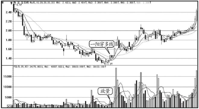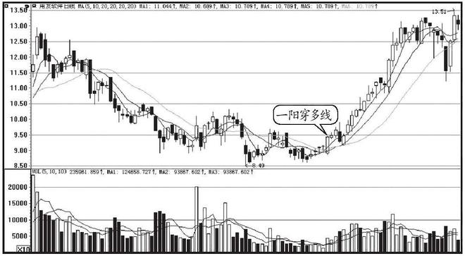 形成一阳穿多线往往意味着下跌趋势的转折,是新一轮上升行情的启动信号。如果之后股价能在均线之上企稳,则转势向上的把握更大。投资者可在出现一阳穿多线后逢低买入。