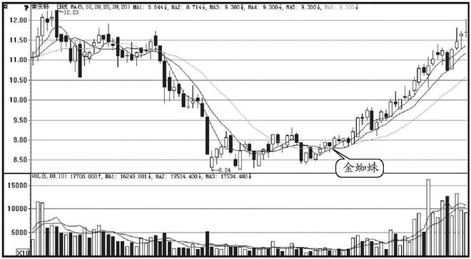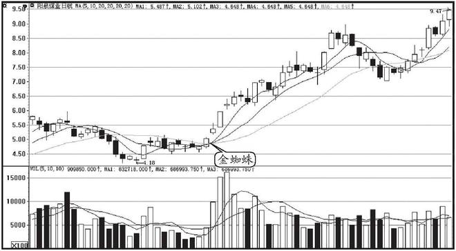 当5日、10日、20日三条平均线探底启稳并扭转向上时,如果同时交叉在某一个价位或某一个价位附近,说明这个价位是近期三条平均线共同的买入成本。最新成交价格在近期三条平均线共同的买入成本之上时,说明近期内买入的人都有盈利。当这种盈利示范被传播后,会吸引更多的人入市,并将股价继续推高。这就意味着股价探底企稳,开始进入上升趋势,投资者可以在金蜘蛛出现后,股价回档时逢低分批买入。